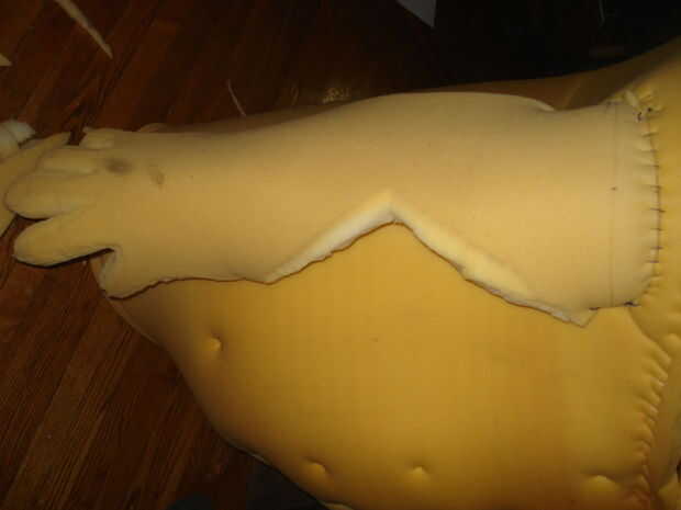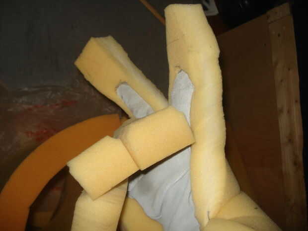 Brazos y manos fueron hechas de espuma con guantes de cuero pegados en las manos. Si se utiliza una espuma más fina en este caso usted puede tener un grosor doble en las manos, pero no pegue al principio. La intención en el corte de los brazos era suficiente espuma para cubrir la parte exterior del brazo, con el interior sólo está cubierto por piel. Cortarlo para que se cuelgue a ligeramente menor que estimado al final de manos de Carol (de la guía de la perspectiva otra vez). Ya que quería que las manos trabajar y ser útil para recoger las cosas, yo estaba planeando en tener la espuma extender un par de pulgadas más allá del final de mi mano, pero tiene los dedos y la almohadilla de la mano ser sobre todo claro. Corte originalmente de la espuma, que también hay que tener en cuenta cuánto fue a la izquierda, fue más amplia hacia las manos para permitir una extensión monstruosa de los dedos después. Luego prueba de usar del traje mostró que los brazos flexionados de extraña, así que corte un triángulo de cada uno con un punto en el codo, que les permiten doblarse hacia adelante (como armas).