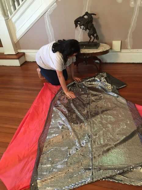 La cantidad de tela que utilice variará con el tamaño de tu tienda, pero es mejor exponer la tela a lo largo de las paredes de la tienda de dentro hacia fuera y pegar sobre con pegamento de aerosol, recorte la parte sobrante después.