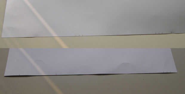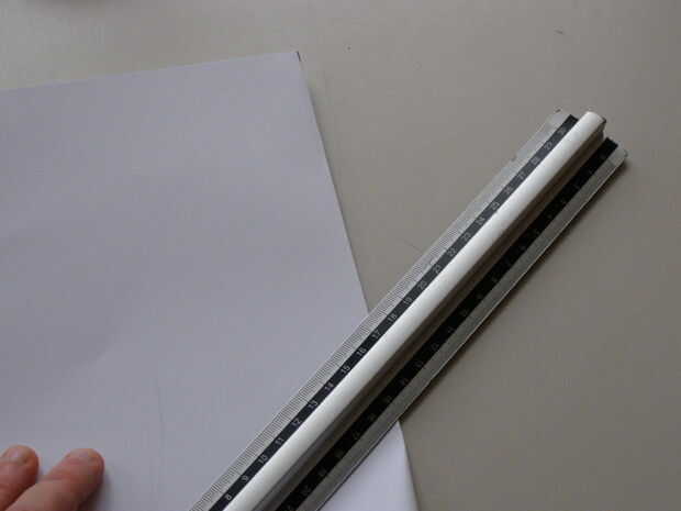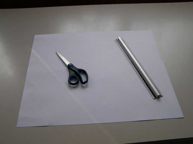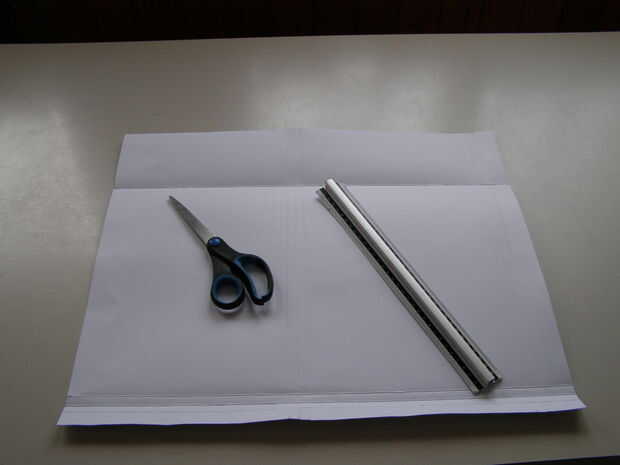 En primer lugar, comenzar a medir desde una esquina esta secuencia: corta de lado 1 cm, 1 cm, 1 cm, lado corto + 1 cm, 1 cm, 1 cm, 2-3 cm. Esto permite cierto margen para las hojas. De la misma esquina, pero por otro lado, medir: 2-3 cm, 1 cm, 1 cm, lado largo + 1 cm, 8-10 cm.