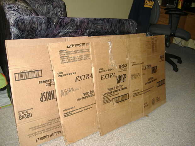 -Caja de cartón o láminas de cartón. Puede llegar desde casi cualquier lugar, yo tengo la mía de trabajo. Ir a una tienda y preguntar si podría tener algunos. Se necesita 2 o 3 cajas.
