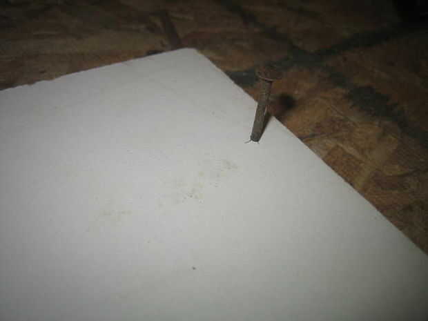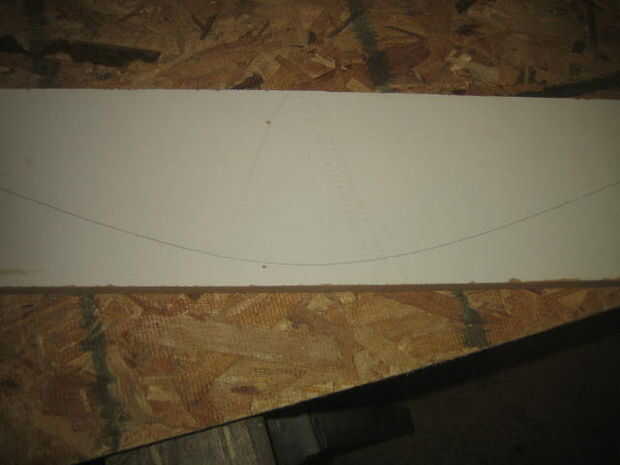 Para marcar la curva, pongo un pequeño clavo de 2" abajo de un extremo, uno en cada extremo de mi pieza.