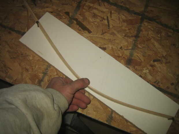 Luego usé una tira fina de madera gruesa de 1/4" y 3/4" ancho como una spline y apoyado contra el dos clavos luego inclinó lo a la curva quería y marcados con un lápiz.