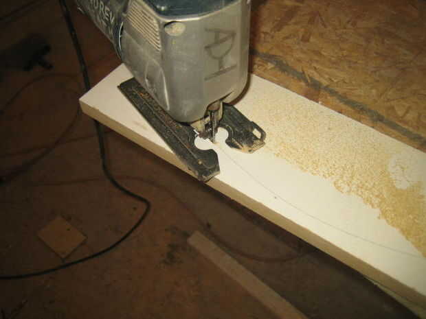 Simple paso, cortar la curva. He utilizado una sierra de calar, pero se puede utilizar una sierra de marquetería, Sierra de contornear, Sierra de cinta, o lo que tengas. Probablemente no una motosierra.