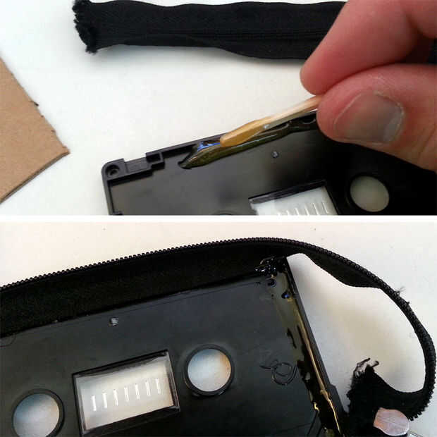Organizar los cassettes reflejados en su parte superior. Con una varilla de mezclar, aplique epoxi dentro de cada lado superior de los cassettes. Trabajo desde el centro de la cremallera, con la cremallera cerrada y la cremallera hacia abajo, presione suavemente cada parte de la cremallera en las tapas con cinta. Presione suavemente para asegurar un buen contacto.