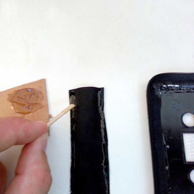 Esperé unos 10 minutos y mi epoxy, mientras que todavía «húmeda», fue capaz de trabajar todo sin romper el vínculo. Abriendo la cremallera de que los lados de la cinta podrían ser pegados. Después de mezclar un nuevo lote de epoxy los lados se pegan utilizando el mismo método que la parte superior, sólo que esta vez con la cremallera abierta. Pegando en etapas el epóxido tiene tiempo para establecer y entre cada sección está trabajando. Después de instala la cremallera dejo el epoxi para curar durante unos 30 minutos.