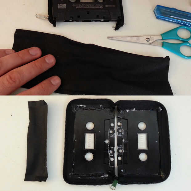 Empiece por descomprimir el cassette y acostado sobre una mesa. Corte un pedazo de tela para el mismo ancho que mis cassettes, entonces (con una nueva hornada de epoxy) la chatarra fue instalada en la parte inferior del cassette.