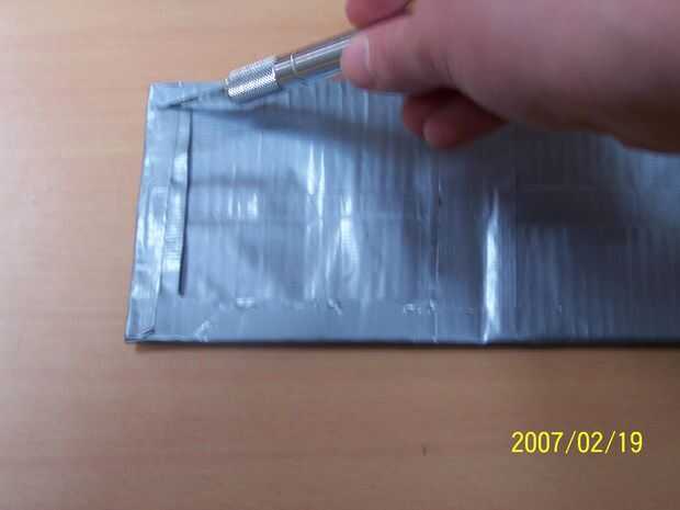 Con un cuchillo de la manía (ser muy cuidado de no cortarse), corte en las aletas que dobla sobre y en la tira de cinta que pones en el medio para que usted puede poner tarjetas en los bolsillos (de lo contrario no habrá suficiente espacio para poner las cartas en).