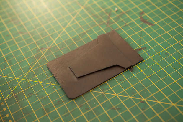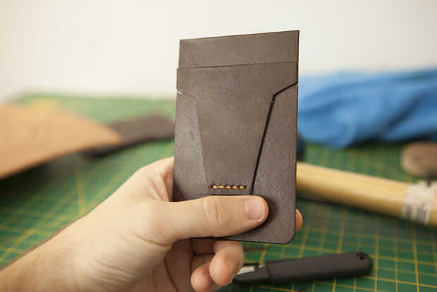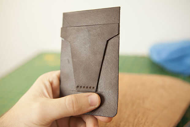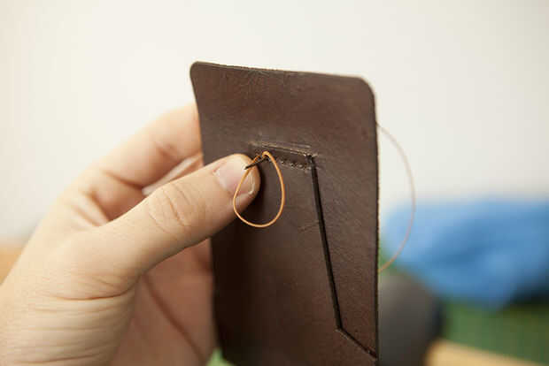 Una vez que el bolsillo se pega en, utilice un cincel de costura para hacer agujeros a lo largo de la parte inferior de la bolsa, aproximadamente 1/8" del borde. Use una puntada de silla de montar para asegurar el bolsillo.