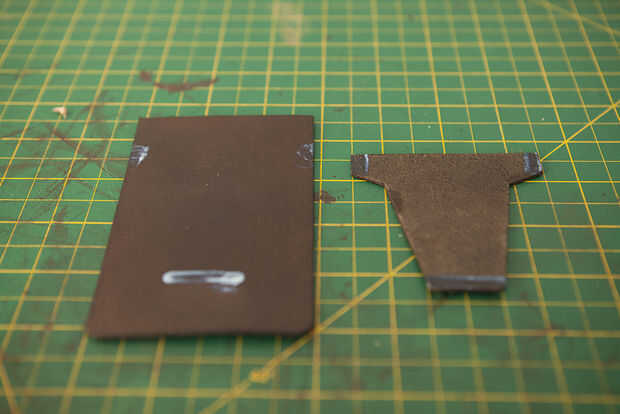 La primera bolsa se une a una de las piezas grandes, 3/4" hacia abajo desde la parte superior. Pegamento de Apple a lo largo de las pestañas laterales y el fondo del bolsillo. Asegúrese de marcar donde la pieza se coloque y aplicar el pegamento en el pedazo grande así.