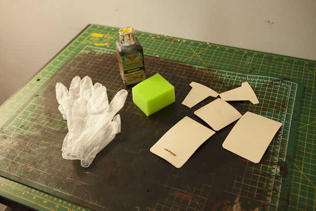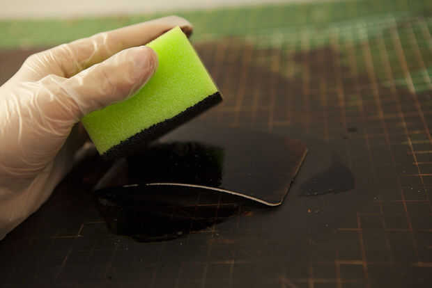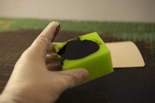 Este tinte marrón oscuro no sale fácilmente, por lo que se requiere guantes y una superficie que no importa. Remoje un tinte en una esponja densa y aplicar liberalmente. Usted realmente necesita trabajar el tinte en conseguir una capa uniforme. Ahora las piezas necesitan secar al menos unas horas.