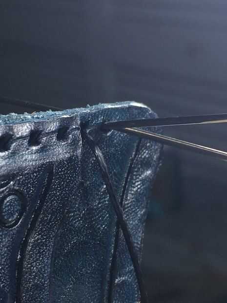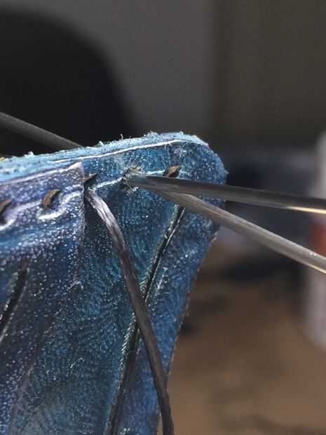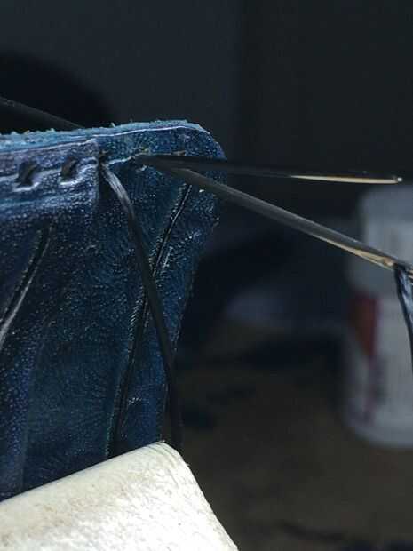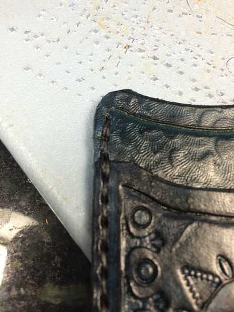 Empezar a coser desde el lado en cada esquina superior, 3 agujeros hacia abajo. Los agujeros son generalmente más grandes en el lado ellos y fáciles de ver y empezar su aguja perforados. Del agujero 3 coser para arriba en el agujero superior y hacia atrás sobre sus puntos de sutura (costura posterior). Esto da mayor durabilidad a las esquinas. Cuando llegue el bolsillo vaya sobre el reborde y espalda coser un agujero entonces volver sobre el labio, esto le da fuerza a este rincón también. Trabajar su manera alrededor al otro lado y repita el proceso. Cuando se la puntada superior posterior 3 agujeros otra vez corte el hilo cerca y queman los extremos de hilo para sujetarla. Yo he fundido una gota de alfiler de la cera aquí en algunos proyectos, pero no esta.