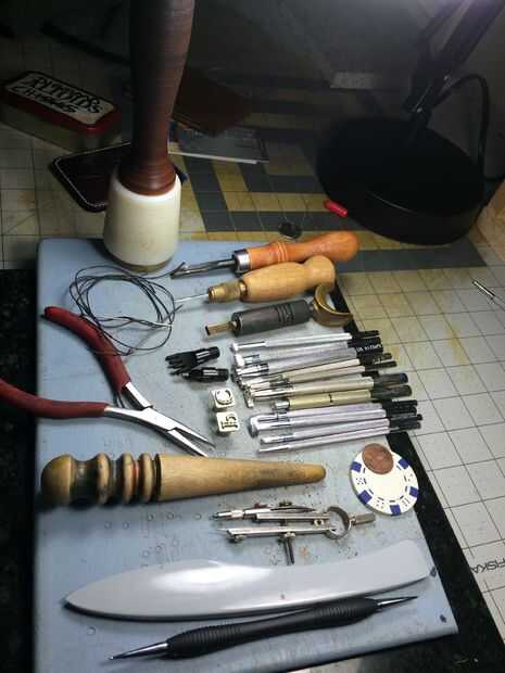 compass\wing separadores, ginsu tijeras, navaja, perforadoras, arnés agujas (extremo embotado), enceradas hilo, mazo, papel de lija, varios sellos de cuero y biseladoras, impermeable de borde, cuchillo del eslabón giratorio, plegadora, cemento de contacto.