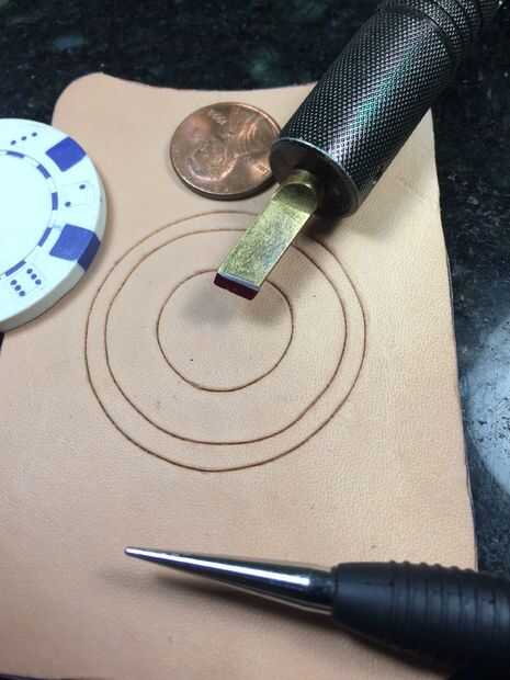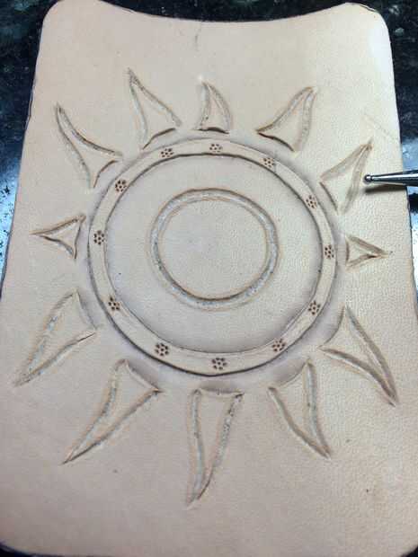 Utilizando un lápiz de punta fina había trazada alrededor de un chip de poker para mi círculo externo luego dibujó un círculo alrededor de una pulgada 1/8 en para completar el anillo exterior. Luego trazó alrededor de un centavo para el centro del círculo y mano dibujaron los rayos del sol. Luego corte las líneas de mi con mi cuchillo giratorio y biselado el anillo con el bisel mirando hacia fuera del ring para darle el efecto de relieve. Luego usé mi lápiz y trazado dentro de las líneas de los rayos para ampliar las diferencias, no Bisele estos salvo en las bases planas más cercanas al ring. Trazado interior el interior del círculo líneas para ampliar a ellos también un poco entonces utilizan varios sellos para rellenar el resto de la imagen.
