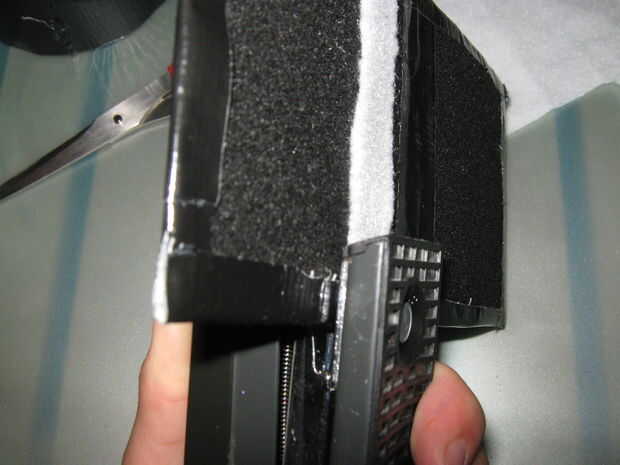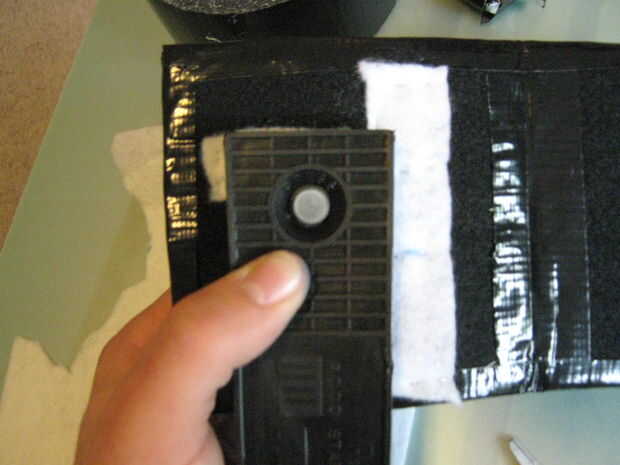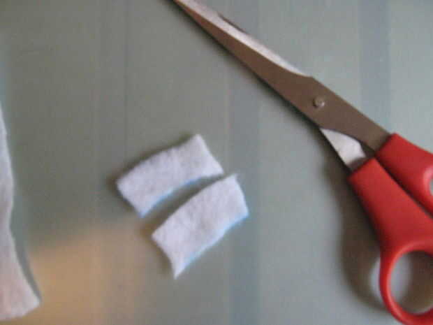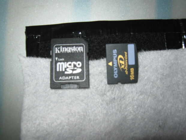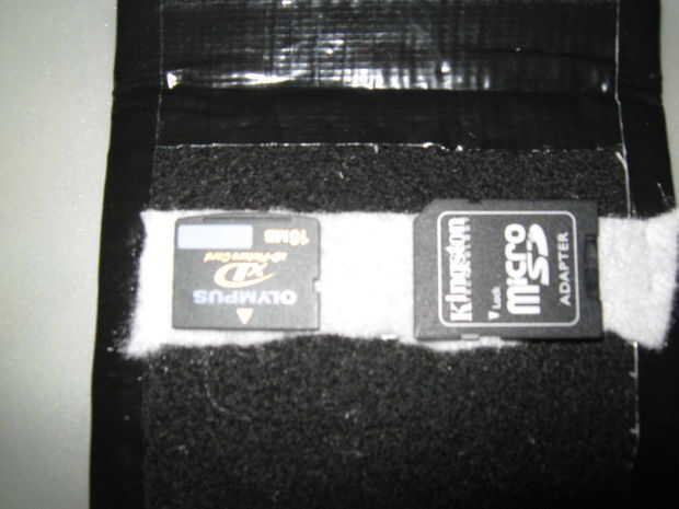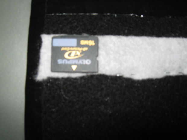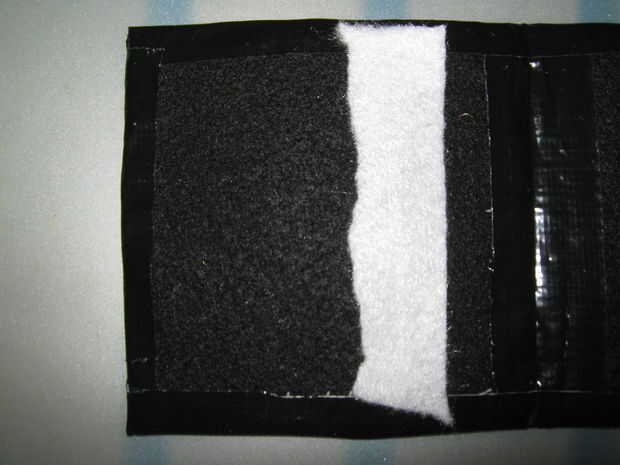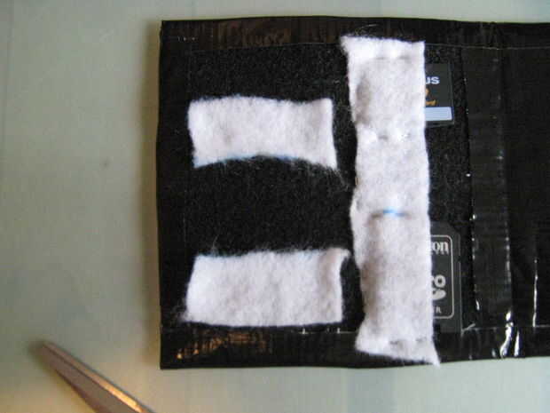 Corte la segunda pieza de fieltro en tiras que encajan dentro de la cartera. Estos serán "mangas" que mantenga sus tarjetas de memoria en su lugar. Puede ser creativo aquí y hacer sus propios arreglos. Coloque estas piezas de fieltro de grapado en su sitio. Asegúrese de medirlas para las tarjetas de memoria!