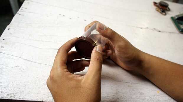 Unir la tapa de galón de agua al plástico laminado. También puede utilizar pegamento o pasta.
