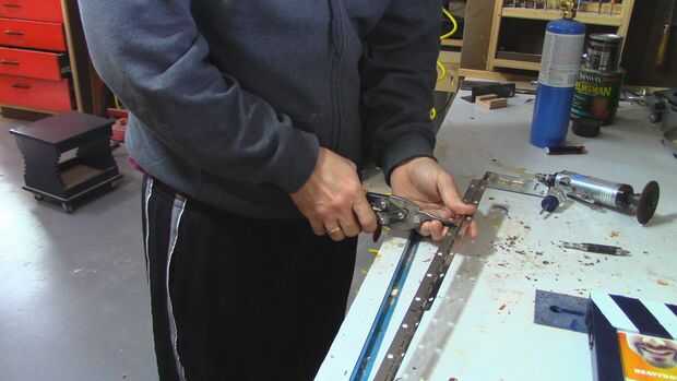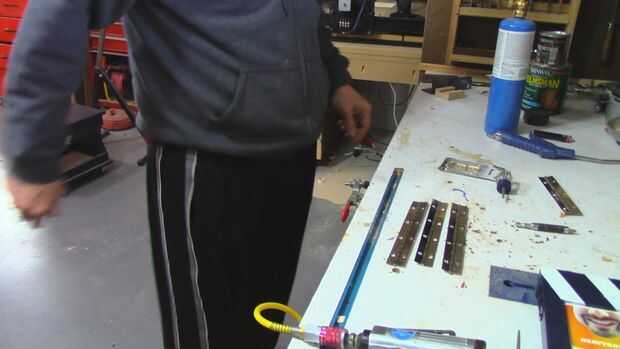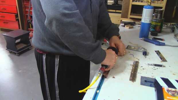 Cortar la bisagra de piano en tres secciones de ocho pulgadas. Utilicé unas tijeras para chapa y una amoladora para cortar la bisagra. Esto puede hacerse fácilmente con una sierra para metales también.