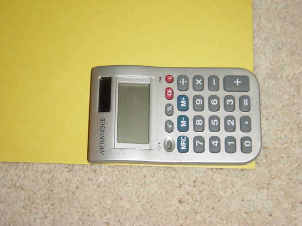 Bien. Ahora que ya tienes los materiales es hora de empezar a construir! Coge una de las piezas de papel de construcción y de la calculadora. Esto va a ser la parte te pegas la cinta, el hueso posterior de la cartera. Ahora, haga una marca a cada lado. Dar sobre un centímetro y medio de un amortiguador a cada lado.
