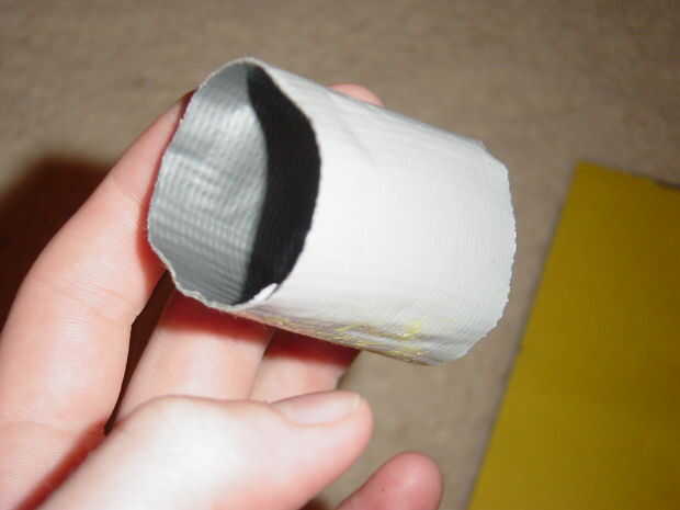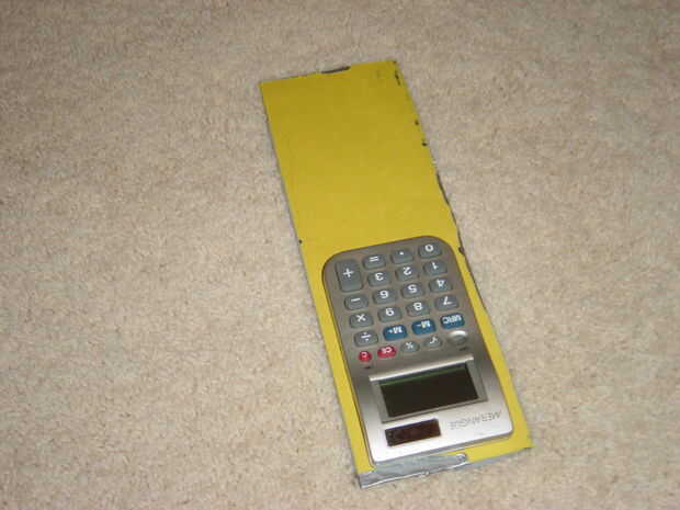 Ya que tienes la pieza posterior grande hecha, ahora usted puede Agregar la calculadora. Hacer un rollo grande de cinta de la cinta. Pegar en la parte trasera de la calculadora, preferiblemente en un lugar plano. Ahora usted puede pegar todo a un lado del papel (ver cuadro 2).