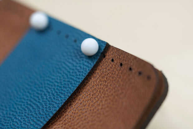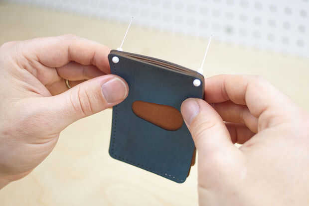 Las piezas de cuero como un sandwich con las caras lisas hacia fuera y las caras de gamuza en la pila. Luego orientar la cartera verticalmente con la línea larga costura a la izquierda. Retire los tapones de los pasadores de costuras e introducir los pasadores en la parte superior derecha y superior izquierda más costura agujeros que pasan por todas las cuatro piezas de cuero.