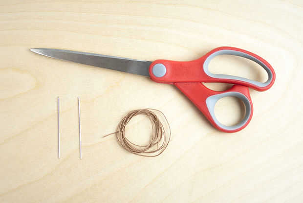 Cortar un extremo del hilo en un ángulo, quitando 1/4" o menos de hilo. Inserte con cuidado en una de las agujas, agarrando el hilo con las puntas de los dedos de la otra mano tan pronto como su a través de la aguja. Jalar el extremo aproximadamente 3/4" más allá del ojo de la aguja y curva detrás hacia el resto del hilo. Repita para la otra aguja.
