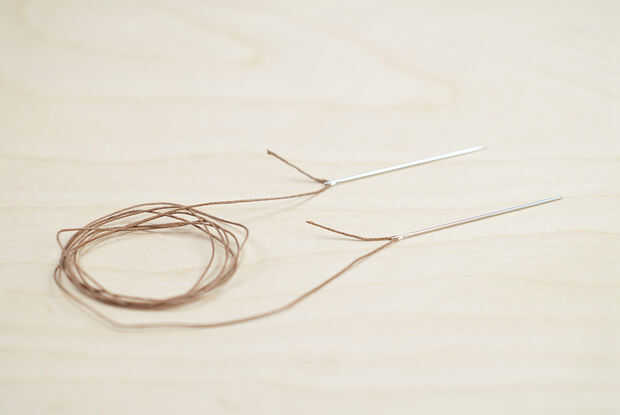 Nota: Este es el paso más difícil. El hilo de lino se adapta muy bien en el ojo de la aguja, por lo que la fricción lo mantiene en su lugar durante la costura y los agujeros de costuras pueden ser pequeño y limpio.