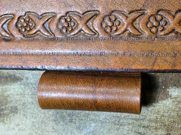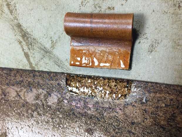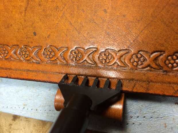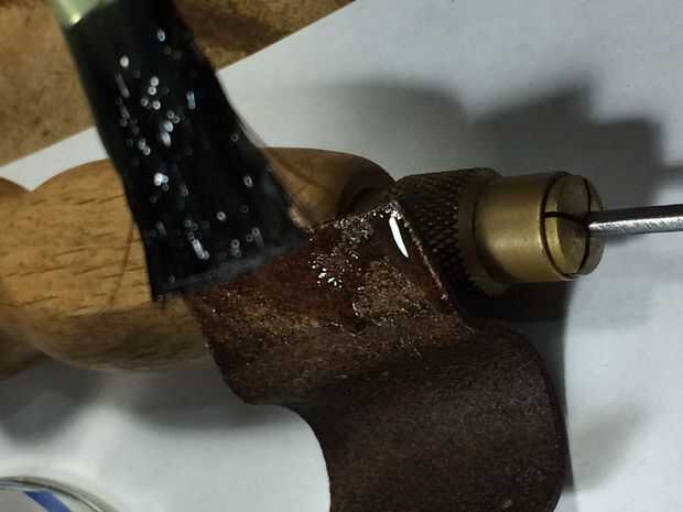 luego justo a lo largo de esa línea oscura en la parte superior (uno decorativo bruñido al principio) Haz una perforación 6 con mi cincel de diamante a través del panel y la pestaña de la pluma,