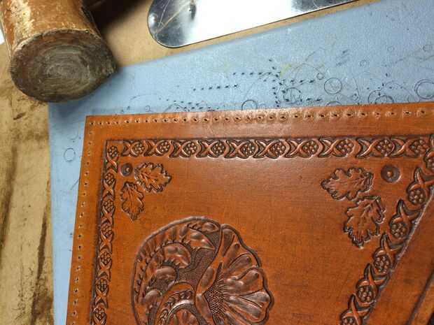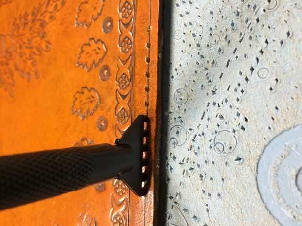 para proteger mi tabla de cortar a menudo uso un pedazo muy grueso de cuero de chatarra entre mi proyecto y mi superficie y siempre hago mis herramientas y en una losa de mármol de un sólido respaldo, derecha de que la tabla sólo parece que no me da un fresco sellado o buena penetración de perforación con el cincel.