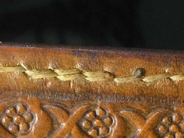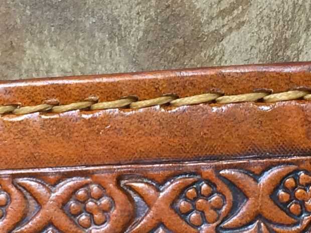 Cuando yo llegue hasta el final de mi largo ate lo alrededor del borde y recortar que mis agujas gratis, a continuación, configurar una nueva longitud y a partir de unos 3 o 4 agujeros espalda cosa sobre los puntos y completar mi proceso de costura, cuando llegue al final que cosa sobre las puntadas de principio 3 o 4 agujeros y snip mis etiquetas apagado como cerrar como sea posible sin mellar mi puntadas , entonces con mi antorcha encendedor queme los extremos para sellarlos. algunas personas utilizan un poco de cera de abejas o un pegamento de la costura aquí, im ok con el proceso de quemado. luego volver y cortar el nudo donde he añadido la nueva longitud del hilo y limpiar así.