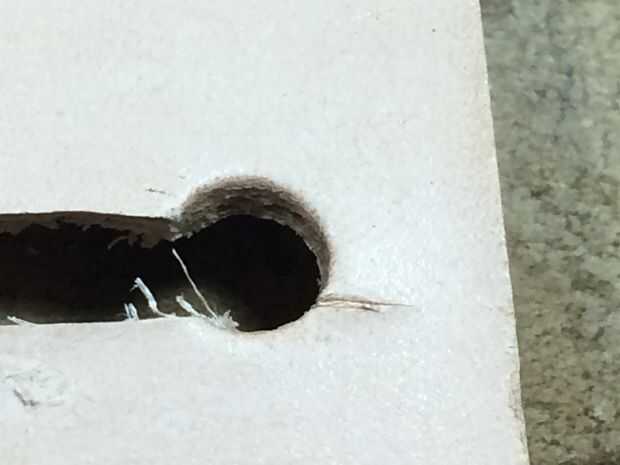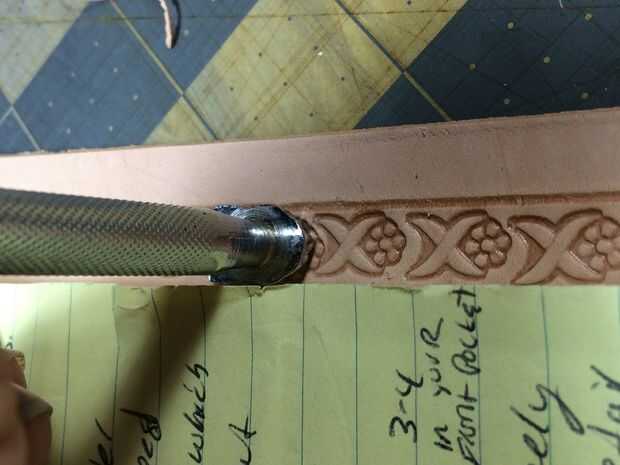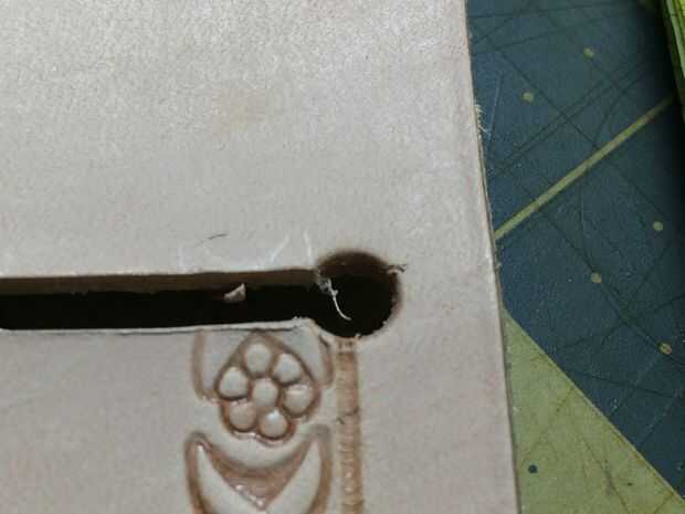 Medido a 1 pulgada desde la parte superior y 3/8 de pulgada desde el borde y perfora agujeros en esos 2 puntos con un punzón de 3/16 de pulgada y luego con la maquinilla de afeitar y la regla corte una ranura ancho 1/8 de pulgada de agujero a agujero, esta brecha da habitación a deslizarse en la almohadilla sin estresar demasiado los extremos ** nota la imagen ** cuando cortar este tipo de ranura siempre parar aproximadamente 1/4 pulgada o tan lejos la conexión del agujero y recortar a ese punto desde el interior del agujero hacia fuera para cumplir con la que punto, es muy fácil adelantar el agujero y el borde opuesto y arruinar la pieza.