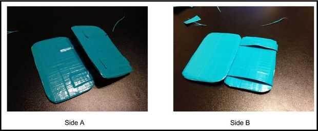 Preparación 4 más pequeños trozos de cinta en su estación de trabajo. Tome las otras dos tiras. Con lado B hacia arriba, enrosque las dos tiras en el centro de la cartera. Deje aproximadamente una pulgada de cinta extra a través de lado A. hacer una X en el centro de estas dos tiras.