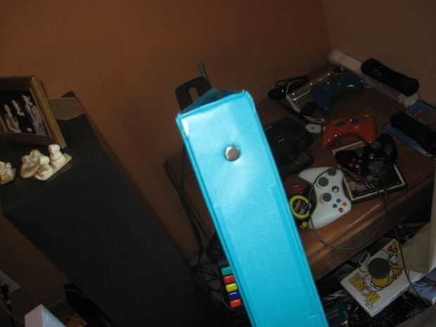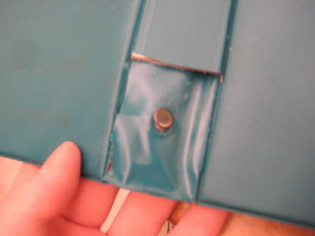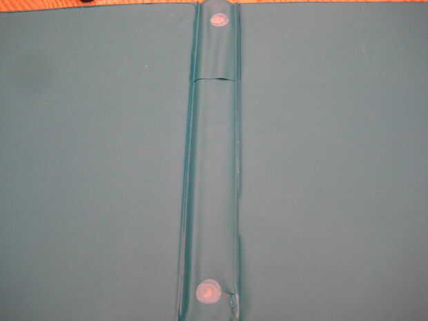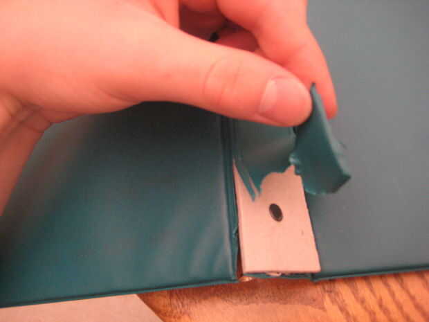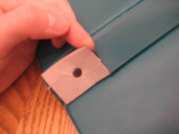 Este es el paso más difícil, el cuaderno que utilicé tenía dos varillas de metal pequeña conexión en la parte superior e inferior. Cortar una parte del plástico del medio hasta el metal primero cortar el cartón. Recortar hasta su muy pequeña y luego se corta un pequeño círculo alrededor de él y sacarlo, trate de dejar tanto de la última capa de plástico como sea posible. Repita para el otro lado. Cinta adhesiva en ambos lados del orificio.