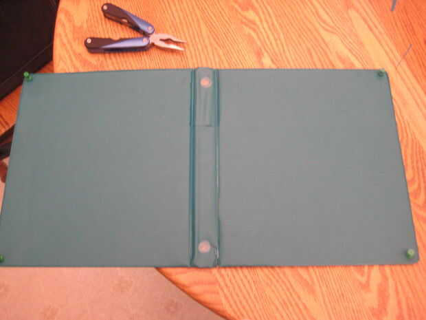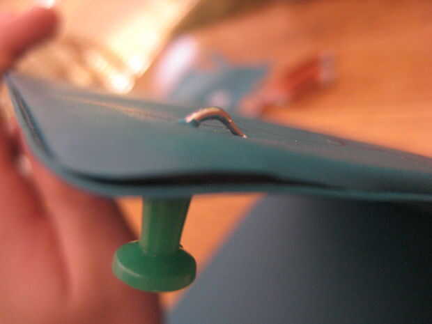 Para este paso, usted podría utilizar un par de cosas diferentes, como las clavijas de madera, pero encontré las chinchetas para funcionar bien. Inserte un perno en cada esquina y luego la curva el punto a un lado con unos alicates o un martillo, asegúrese de que su robusta y no volar.