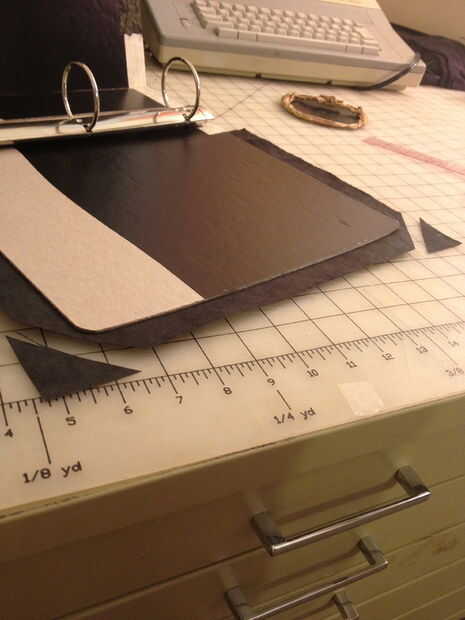 Ponen plano hacia fuera su carpeta con la cara cubierta (el lado con el papel pegado a él) sobre la mesa.