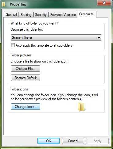Haga clic derecho sobre la carpeta y seleccione Propiedades. En las fichas seleccionar personalizar y luego pulse Cambiar icono.