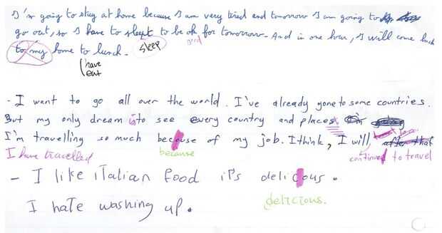 Usted debe volver y corregir anteriores trabajar cada semana y tu cartera debería mostrar esto. Corrección de gramática, ortografía y demás errores es necesario. Usar una pluma de color diferente para que el profesor pueda ver su progreso.