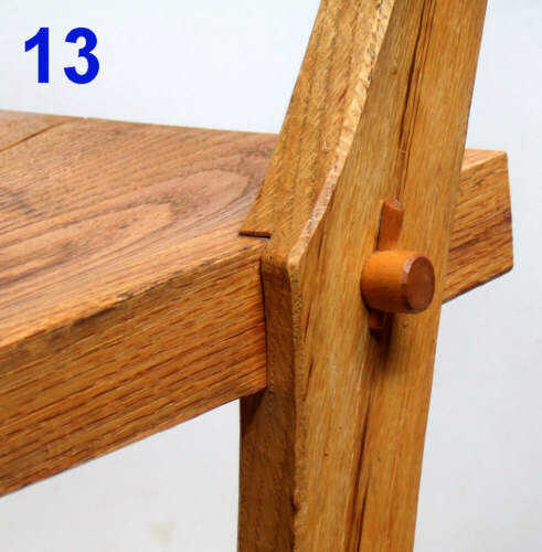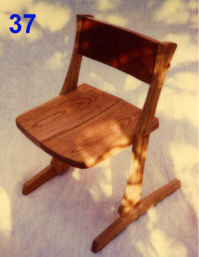 Silla de trabajo 37, roble y cerezo de PIC. La parte de atrás gira sobre dos espigas de la clavija permitiendo uno a sentarse en posición vertical para escribir o encorvarse en un ángulo más escarpado.