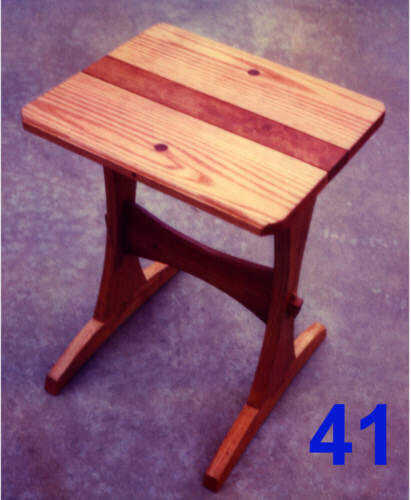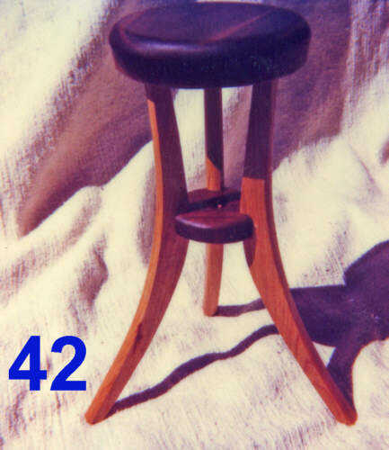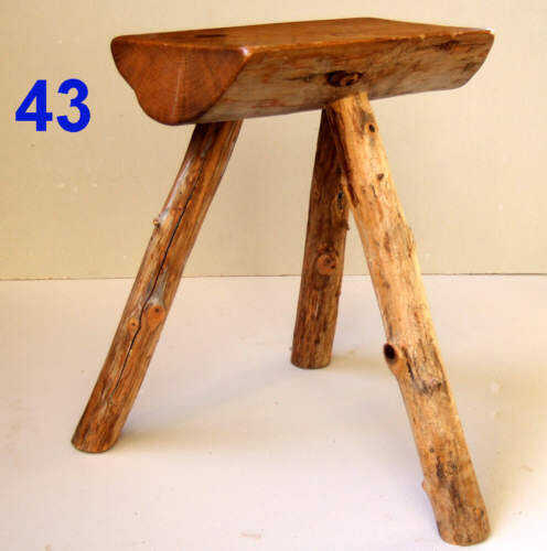 Las heces en el Pic 43 son uno de los más sencillos que se puede hacer. Es un diseño americano colonial antiguo. El asiento está tallado de una sección de 18" de un registro que fue partido por la mitad. Utilizar ramas de enebro seco para las piernas. En este taburete até las piernas a un asiento de verde abeto de Douglas. Esto asegura que la madera verde se reduciría alrededor de las ramas más secas para mantenerlos apretados. Después de más de 20 años las piernas todavía están bloqueadas apretado.