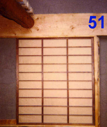 Foto 51 muestra una pantalla shoji que utiliza papel de bolsa de papel en vez del tradicional papel de arroz. El documento fue pegado en con almidón de maíz hervido a una pasta. Cuando el pegamento se seca se contrae los bordes del papel para que sale firmemente como un tambor.