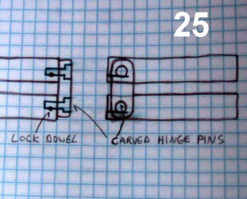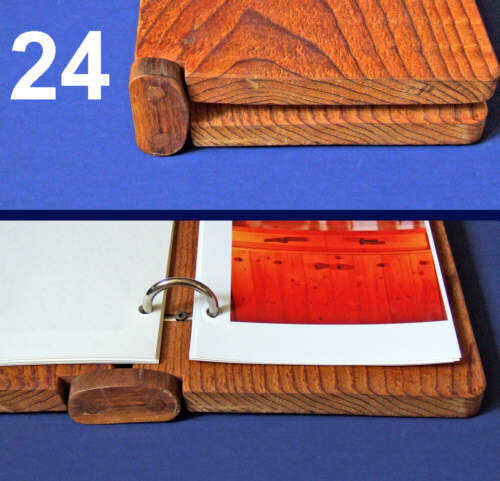 PIC muestra un libro de fotos que hice con bisagras de madera. Dos pasadores pivote en cada bisagra para permitir que el libro abrir completamente. Hice trampa y utilizar anillos de metal D sujeto por tres tornillos extraíbles para quitar o agregar páginas fácilmente. Pero lo mismo podría haber hecho con lazos de cuero o cuerda para unir las páginas. Foto 25 muestra los detalles de la bisagra.