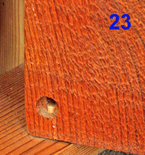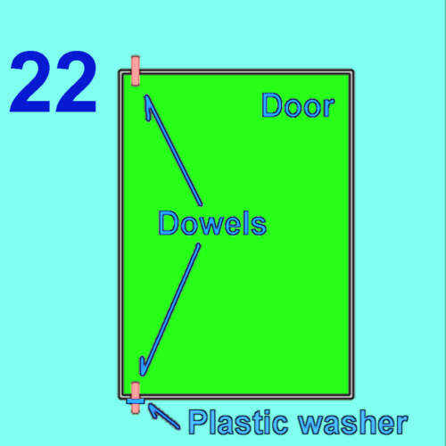 Foto 23 muestra la parte inferior de la puerta del armario con un alfiler oculto superior y un orificio de acceso que se utiliza para instalar el perno inferior. El pasador inferior pasa a través de una arandela de plástico que actúa como un cojinete y de cualquier plástico fino se puede cortar. Los pasadores se frotan con cera de abeja para reducir la fricción, pero obras de cera de la vela también.