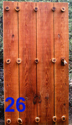Era en un principio le preocupaba que los tacos de abedul (la clase encuentra en la mayoría de las ferreterías) usaría los rodamientos de los agujeros ya que un roce a menudo más suave madera (pino, abeto o cedro) de madera dura. Resultó que no debe ser un problema. Mi puerta (foto 26) tiene 1" espigas y el fondo y mis puertas de gabinete tienen espigas de 1/4". Ninguno de los tacos ha demostrado significativo desgaste después de más de veinte años de uso diario. Para puertas más grandes, como la puerta de entrada, la puse en un cojinete de madera de roble o nogal.