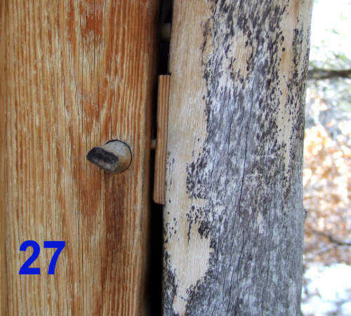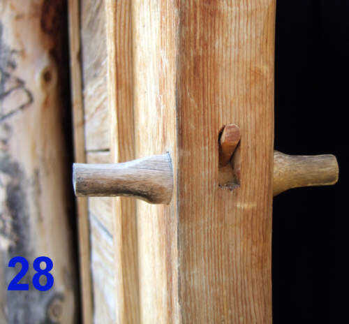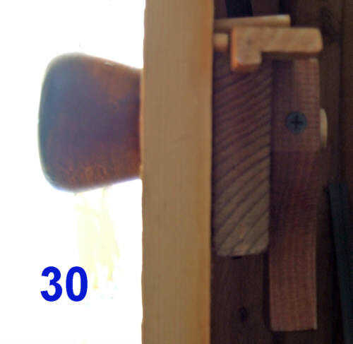 Bloqueo de puerta simple se puede hacer usando sólo dos espigas. 3/4" a 1" espiga se inserta a través de la puerta. Una clavija de 1/4" es perforada en las espigas de la manija para hacer el cierre. Foto 29 muestra la puerta cerrada y trabada en un surco cortado en un bloque en el marco de la puerta.