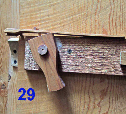 Foto 29 y 30 de Pic muestra un retén de resorte que usa roble fino como un resorte. Una perilla de puerta de madera en un lado y una palanca en el otro activan el cierre. Hice trampa y use algunos tornillos para sostener algunas de las piezas sobre una puerta que fue sujetado con tornillos.