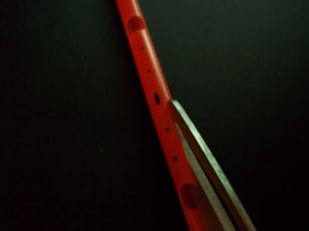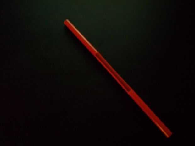 Cuidadosamente perforar un agujero de medio círculo en ambos extremos de la ventana de nivel. Perforando la paja de esta manera, usted evitará perforando un agujero correspondiente en el lado opuesto de la paja. Recuerde, estamos haciendo la ventana en solamente un lado de la paja. Si marcó en centímetros, los dos Perfore orificios será seis centímetros apartes. Use sus tijeras para abrir el resto de la ventana. Esto puede tomar algunos intentos para afeitar todo lejos del material. Su paja nivel ventana debe parecerse a las imágenes. Si hace demasiado grande la ventana, la paja de la flexión y torcer demasiado.