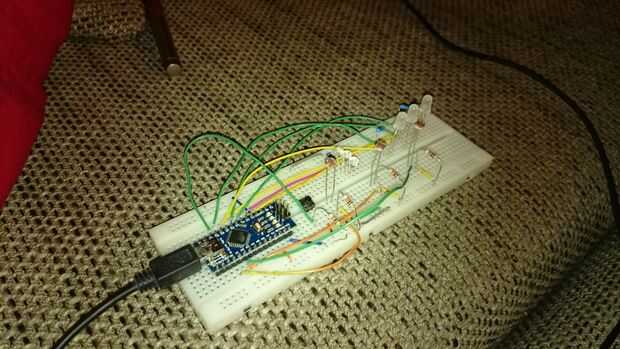 Para la detección real de los coches he utilizado 3 resistencias sensores luz en 3 carriles. Están conectados a los pines analógicos de Arduino. Todos tienen un 10k baje la resistencia a tierra. Tres LEDs blancos en el puente por encima de ellos asegurarse de que tienen suficiente luz para "ver" los coches.