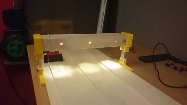 Mi final es la construcción de 2 sistemas. Sistema uno es el LED de dos colores que muestran inmediatamente cuando un coche cruza la línea en qué lugar terminó. El LED verde de colores cuando usted es primero, no se enciende cuando eres segundo y va rojo cuando está pasado.
