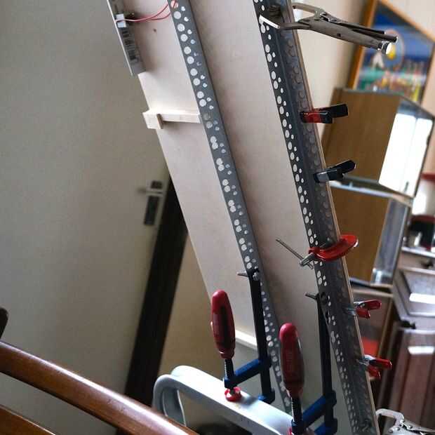 En la parte posterior de la parte de inicio, he añadido un perfil en L extra y una pinza de madera extra. Así que ahora el comienzo se une a una mesa o una silla con dos abrazaderas. Esto hace que toda la construcción mucho sterdier.