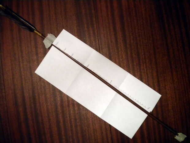 Utilice el papel legal y regla para medir una guía para cada flecha basándose en la información de flecha de la carrera. Centro de la guía en el eje de la flecha y marque su punto de partida con cinta de enmascarar (permitir aproximadamente 1" sala de fudge como estos siempre tienden a correr más de lo esperado).