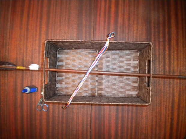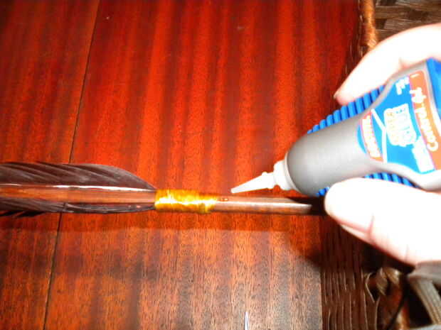 Flecha del hilo a través de asas de la cesta.  Esto le ayudará a mantener la flecha en su lugar mientras gira para aplicar la seda del bordado.  Aplicar una fina línea de pegamento, 1/8" largo en la parte posterior del eje de la flecha.