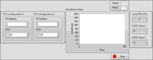 En el panel frontal, el TCP de entrada información y ya está listo para ejecutar el VI. Asegúrese de que tiene el controlador de movimiento salto conectado y no dude en hacer un ejemplo para el salto para asegurarse de que está trabajando en LabVIEW a través de los ejemplos incluidos.